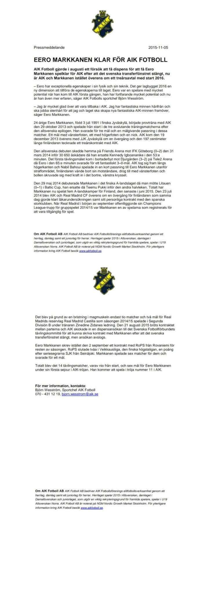 – On mahtavaa päästä harjoittelemaan ja pelaamaan heti marraskuussa seuraan. Olen seurannut AIK:ta koko vuoden ja harmitellut mestaruuden karkaamista. On itsestään selvää, että AIK ja minä haemme mestaruutta ensi kaudella. Odotan myös itseltäni paljon, sillä olen oppinut matkan varrella paljon ja sekä ihmisenä että pelaajana paljon paremmin kuin siirtyessäni pois.